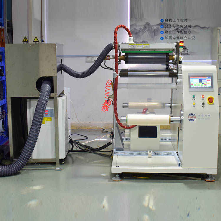 將高壓高頻電流施加于水平放置的放電電極上,在電極之間產(chǎn)生細(xì)小密集的藍(lán)紫色火花使空氣電離,這些空氣電離產(chǎn)生的等離子體在強(qiáng)電場(chǎng)的作用下加速并沖擊被處理PET的聚合物表面,而等離子體粒子的能量可以誘導(dǎo)化學(xué)鍵斷裂和聚合物表面的分子降解,在表面分子鏈上形成羰基和含氮的極性基團(tuán),使被材料的表面張力明顯增加,而材料表面因強(qiáng)離子沖擊而粗化;協(xié)同效應(yīng)使被處理材料的粘附性明顯改善,同時(shí)實(shí)現(xiàn)對(duì)PET材料進(jìn)行等離子表面活化和處理,提高PET的表面能和浸潤(rùn)能力、粘貼性。